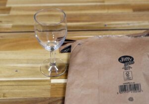 We selected 3 Padded Mailing Bags, and packed a wine glass in each. Several pieces of Blue Roll were placed in the wine glass, just in case the glasses broke, and to minimise the risk to us when filming.
