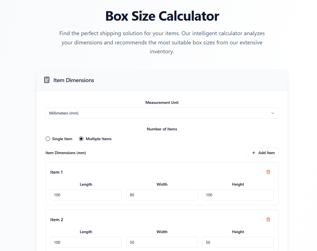 Our Box Size Calculator Tool is a smart, easy-to-use online tool that helps you choose the perfect-sized box for your products. Whether you’re packing a single item or handling complex multi-product shipments, it’s designed to: